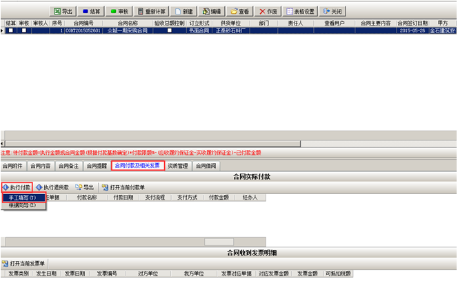 在工地現(xiàn)場材料管理過程中,如果工地現(xiàn)場采購大量材料需要簽訂采購合同并在到貨之前付預(yù)付款時,我們要在采購合同中,選中對應(yīng)的采購合同,點擊[合同付款及相關(guān)發(fā)票],點擊[執(zhí)行付款]-[手工填寫]彈出“付款申請單”,在“付款申請單”中選擇執(zhí)行“采購合同”,并選擇對應(yīng)的“合同編號”,選擇“支付方式”,選擇“付款名稱”為“訂貨款”,并在“付款金額”里面輸入“預(yù)付款”金額,“付款申請單”添加完成之后點擊[保存]的按鈕保存單據(jù),如圖: