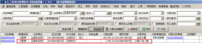 在工地現(xiàn)場材料管理過程中,如果沒有采購合同,材料采購入庫之后,可在“材料入庫單”列表里面,選中單據(jù),直接點擊[付款]按鈕,添加[付款申請單],執(zhí)行付款。如圖: