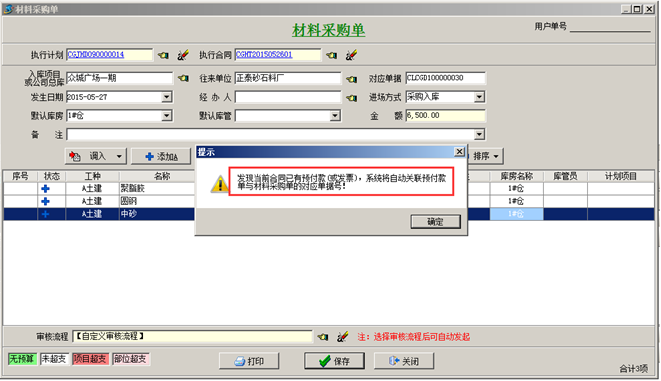 在工地現(xiàn)場材料管理過程中,材料到貨之后,可以做采購入庫單(材料驗收單)執(zhí)行驗收入庫(或直進(jìn)項目)。或在“合同內(nèi)容”里面,點擊[到貨驗收],在彈出“采購入庫單”(材料驗收單),在單據(jù)中輸入“驗收數(shù)量”,保存時系統(tǒng)會提示自動關(guān)聯(lián)第一次預(yù)付款,“確定”之后保存,如圖: