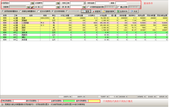 如果要查看材料采購的執(zhí)行情況,可進(jìn)入到[采購計劃執(zhí)行查詢]里面按照查詢條件進(jìn)行查詢。可根據(jù)材料顯示的不同的顏色看出材料的采購計劃執(zhí)行情況,如圖: