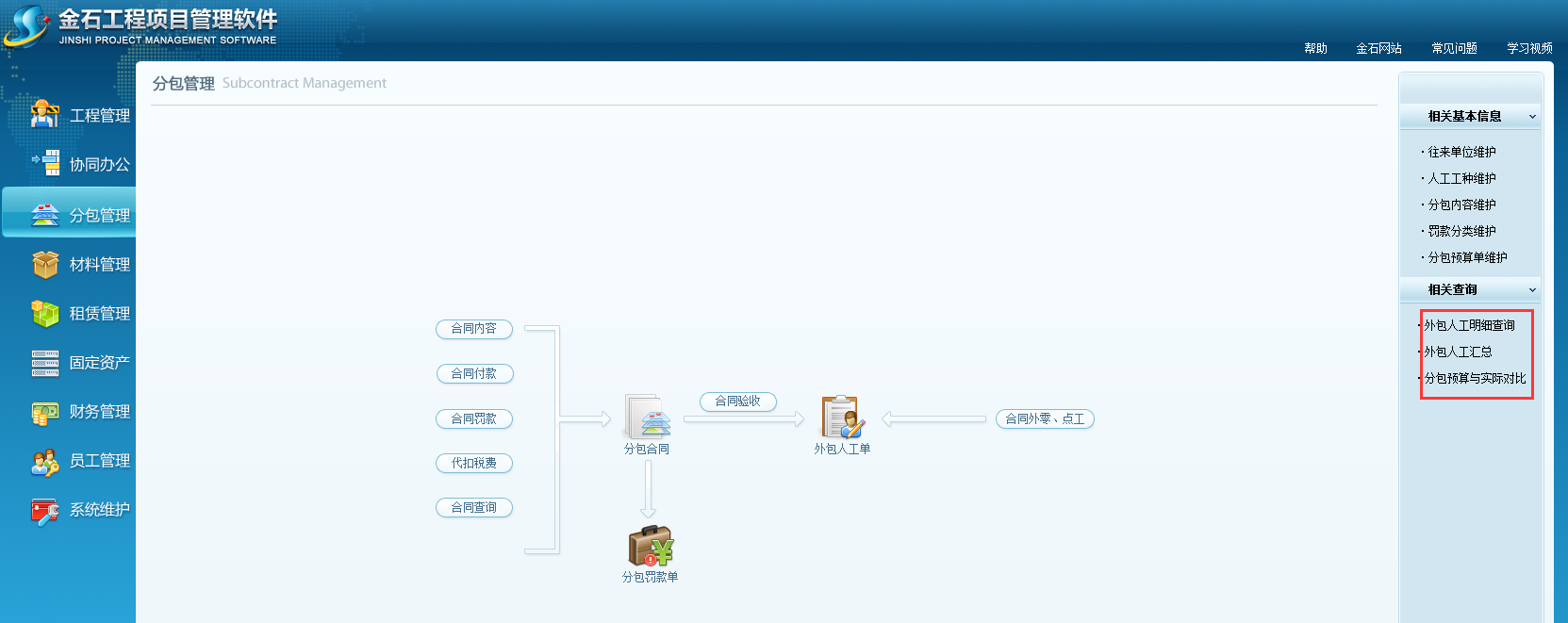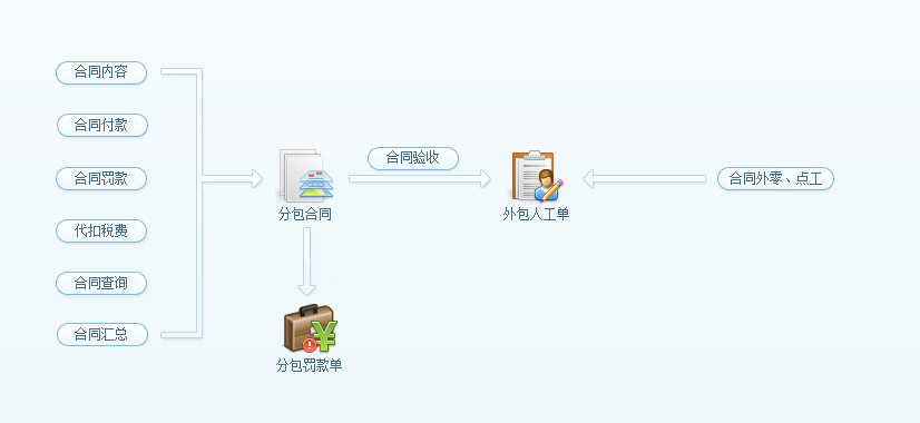 工程項目分包管理,可用于統計專業分包產生的成本及臨時雇用的零工成本。如軟件流程圖所示:分包成本是由外包人工單產成,其來源可分為兩部分,第一:來自分包合同中的合同驗收,第二:來自合同外零、點工驗收。