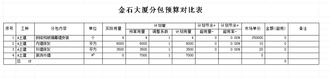 備注:調整系統說明:在實際的工程量投標中,某些施工企業為了中標而做低預算量,還有其它的原因如:一些分包根據以往的施工經驗總會有一定的偏差。這里用調整系數是為了將最終要參與比較的【計劃用量】、【計劃用量】調整到接近于預期最真實的值。