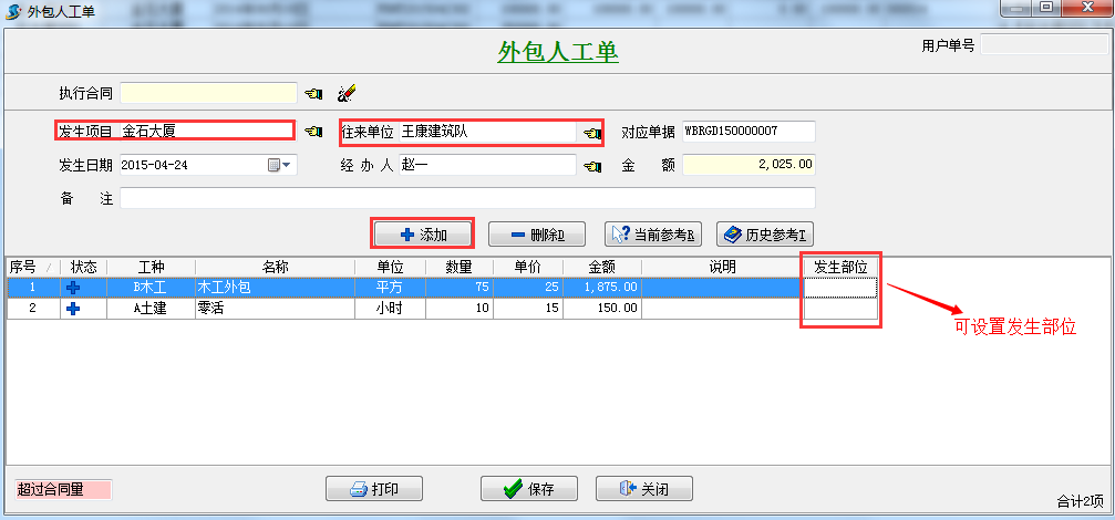 工程項目分包成本是由外包人工單產成,其來源可分為兩部分,第一:來自分包合同中的合同驗收,第二:來自合同外零、點工驗收。 合同驗收和合同外零、點工驗收,都要建立外包人工單,兩者的區別在于,前者在外包人工單中執行的合同(可以讀取到合同內的相關信息,如合同量、上報量等),后者在外包人工單中未執行合同。