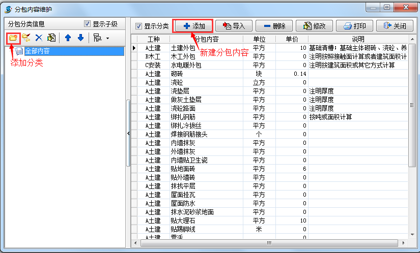 在做工程項目分包管理之前要做好往來單位維護,人工工種維護,分包內容維護,罰款分類維護,分包預算單維護。