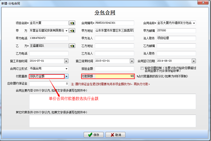 上圖帶紅框的注意填寫正確,其中帶*為必填項。尤其注意【付款基數】、【付款限額】這些項都會直接影響到該合同的待付款。