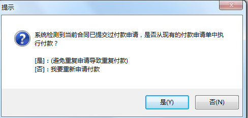 在合同付款及相關發票處點擊付款生成付款申請單,系統會自動提示你已有預付款。