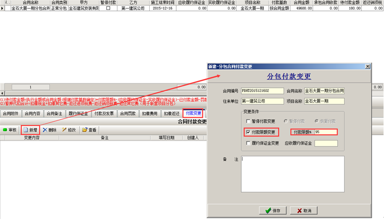 一般合同驗(yàn)收完成之后,按照合同條款支付到95%,此時(shí)添加“付款變更單”,如圖所示: