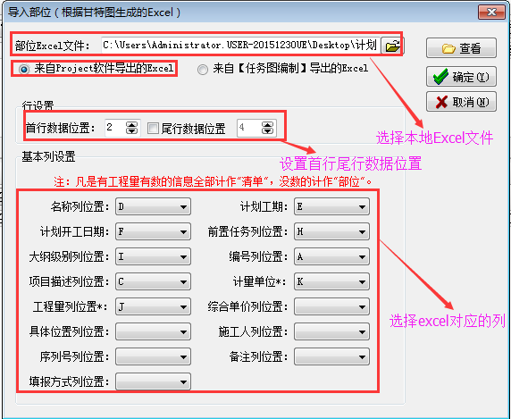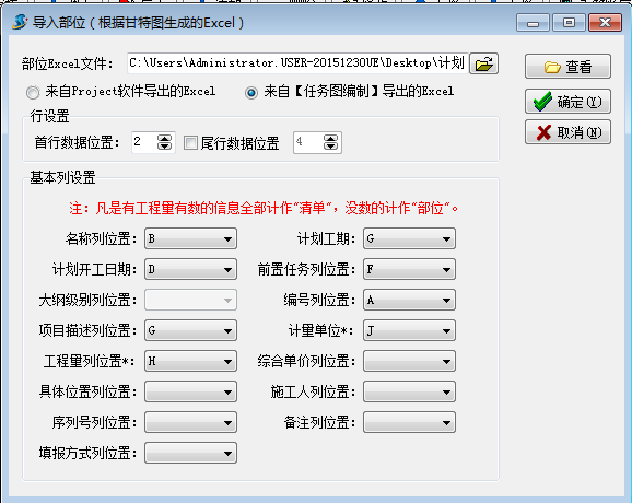 上圖為來自project軟件導出的excel格式。在進度管理中導入時選擇好本地excel文件,設(shè)置好首行尾行數(shù)據(jù)位置,選擇好對應(yīng)excel表中各列位置,即可選擇確定導入,如下圖: