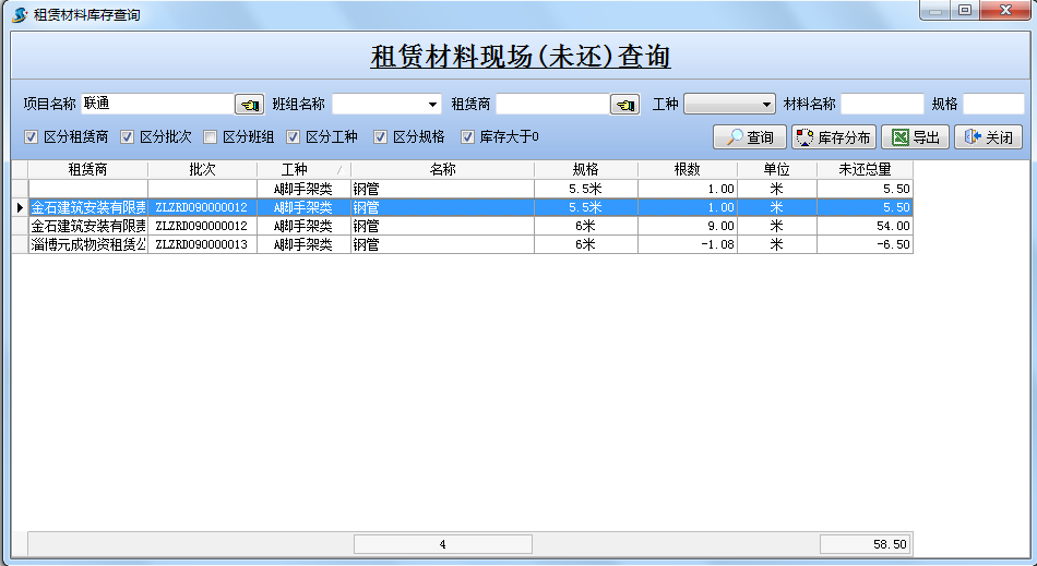 查詢下租賃的庫(kù)存可看到一根鋼管的規(guī)格已經(jīng)改變?yōu)?.5米,如下圖: