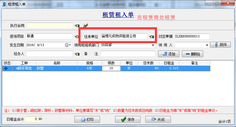 2、 租入對(duì)方單位“淄博元成物資租賃公司”10根6米的鋼管