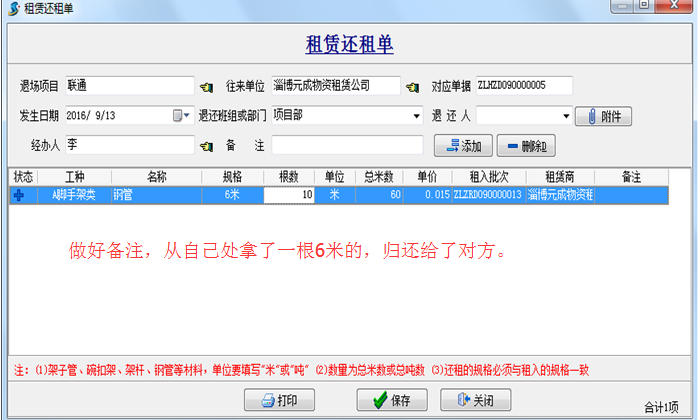 3、在還的時(shí)候發(fā)現(xiàn)其中有一根6米的損耗成5.5米了,把自己的1根6米還給對(duì)方,租金扔按10根6米算。(實(shí)際是把損耗后的5.5米與自己的6米做了對(duì)換,即:歸還給了淄博元成物資租賃公司6米,自己實(shí)際還剩下一根5.5米鋼管)