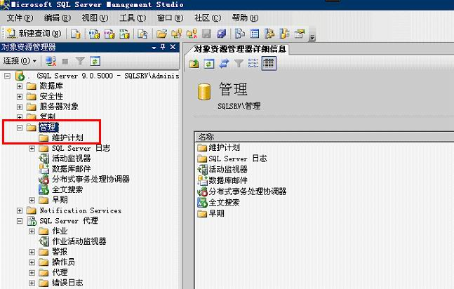 3、在【對(duì)象資源管理器】窗口里選擇【管理】——【維護(hù)計(jì)劃】選項(xiàng)。