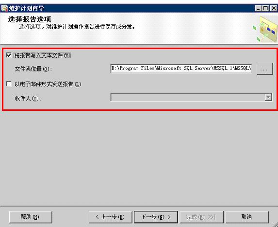 10、彈出【選擇報(bào)告選項(xiàng)】對(duì)話框,在該對(duì)話框里可以選擇如何管理維護(hù)計(jì)劃報(bào)告:可以將報(bào)告寫入文件中,或通過電子郵件發(fā)送數(shù)據(jù)庫管理員。設(shè)置完畢后單擊【下一步】按鈕。
