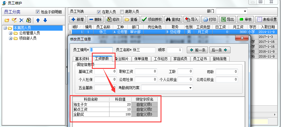 在工資表中我們已經做了工資參數,但往往因一些公司工資計算方式比較特殊導致不夠用,現增加了工資自定義功能用法如下