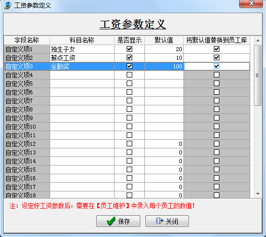 填寫科目名稱和默認值,是否顯示打勾,是否將默認值替換到員工庫