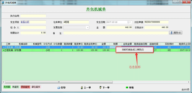 輸入發生項目、往來單位、時間、經辦人和審核流程方案并添加機械明細,然后點擊機械明細行,會彈出機械編輯窗口(如上圖右)編輯實際發生相關參數,如計價數量,機械發生的起始日期和時間和單價等后點擊生成二維碼,結果得到如下圖左,