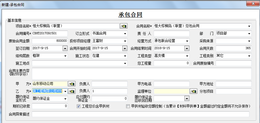 ①在“恒大棕櫚島(聯(lián)營)”項目下創(chuàng)建“承包合同”、“分包合同”等