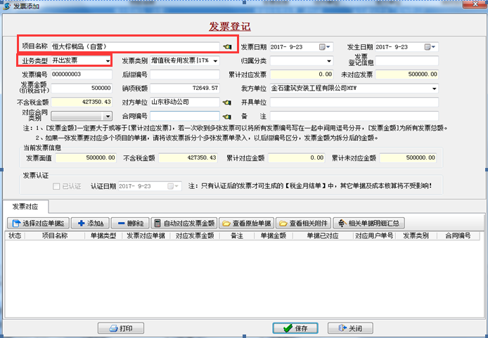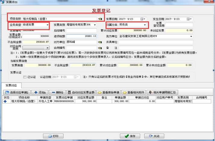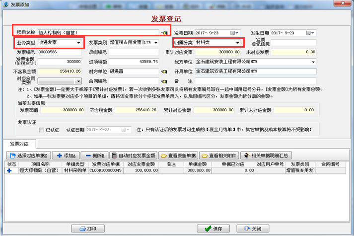 ②進(jìn)項稅對應(yīng)材料票:菜單欄【財務(wù)管理】→【發(fā)票管理】“收進(jìn)發(fā)票”歸屬分類選材料票(在一個項目中應(yīng)控制材料票、勞務(wù)票等所占的比例,此功能用于計算掛靠單位發(fā)票歸屬所占百分比)