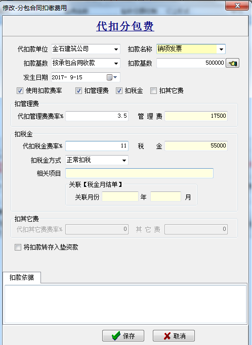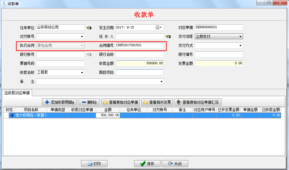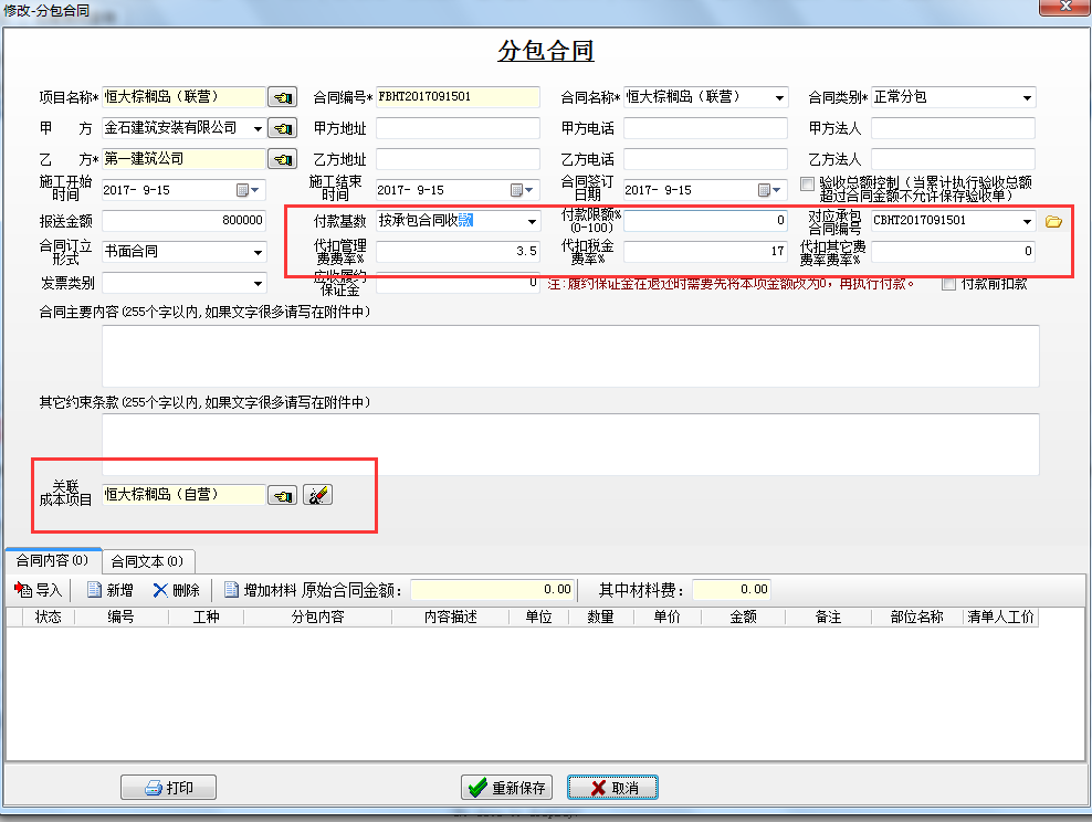 ③“分包合同”“按承包合同收款”,并“對應(yīng)承包合同編號” “關(guān)聯(lián)成本項目”(為了查詢發(fā)票情況自動匯總和歸屬分類)