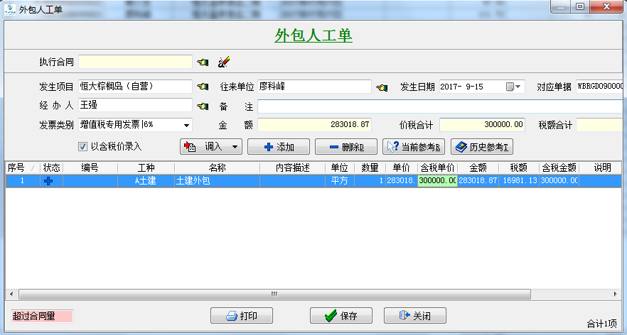 ①在“恒大棕櫚島(自營)”項目下驗收(如有預(yù)算先做預(yù)算單)【材料采購單】和【外包人工單】各30萬元并對應(yīng)“進(jìn)項發(fā)票”。