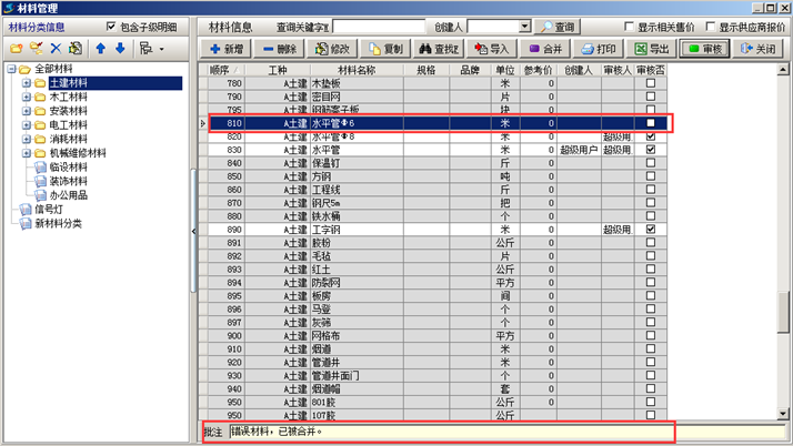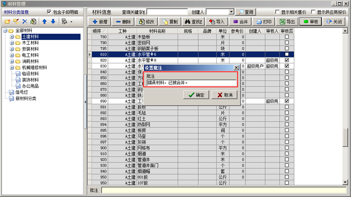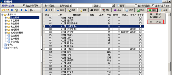 在工地人員使用工程管理軟件錄入業務單據過程中,往往對工程管理軟件的材料庫中維護員添加的材料不熟悉,已經維護好的材料在工程管理軟件中經常找不到,自行添加了材料,但自己添加的材料和維護員添加的材料名稱差別很大,這樣程序無法識別是否有重復。此時需要讓維護員利用工程管理軟件的 【審核提醒】+【事后糾正】+【錯誤批注】 來在過程中指導工地人員的使用,糾正和統一材料的名稱的叫法。