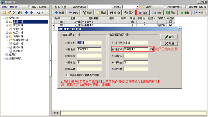 將已經存在于工程管理軟件材料庫中的材料進行【合并】,選中錯誤的材料,點擊“合并”,在彈出的“合并材料”的對話框中選擇正確的材料名稱,所選擇的材料名稱必須是系統中已經審核通過的材料。如圖所示: