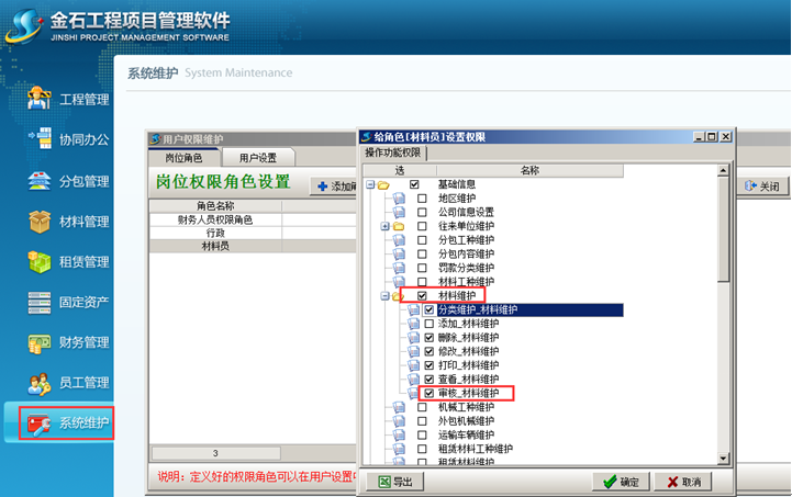 1、首先將 “審核_材料”的功能單獨分配給材料維護員一人。在系統中給工作人員分配權限,如圖所示: