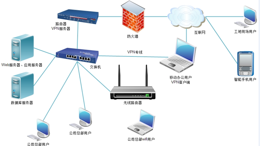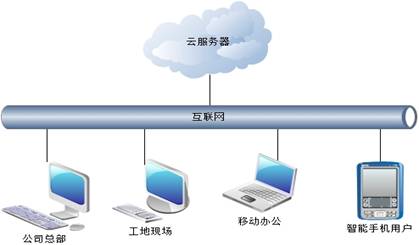 普通版,適用于操作員在公司總部辦公為主的公司,服務器架設在公司總部,工作總部工作人員可通過公司部署的局域網訪問服務器,工地現場及移動辦公用戶采用互聯網訪問的方法使用軟件,為了訪問穩定及數據安全可以在公司總部架設vpn 或域名解析軟件,廣域網操作用戶采用vpn撥號、或域名訪問的連接的方式連入公司局域網內。