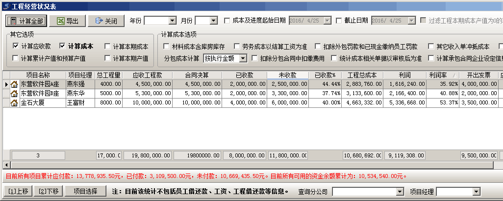 可查詢出項目(包括所有項目、某一子公司的項目、某資質承接的項目、某項目經理承包的項目、某開工年度的項目)結算進度、應收工程款、已收款、未收款、工程總成本、完成產值、利潤、開出發票、收到發票等信息,并統計出目前可用資金余額。