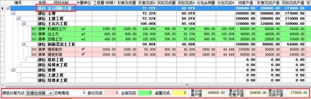 對于某些工程,高水平的項目經理可以把實際完成量做小,需要的達到的效果是“實際干的進度小于向甲方上報的進度”。在金石軟件中能很好地體現“實際進度”、“形象進度”兩個概念,在進度填報過程中可以將“實際進度”、“形象進度”分別填報。并且將清單“甲方合同量”、“分包合同量”、“形象完成量”、“實際完成量”四者的關系完全展現在一起。