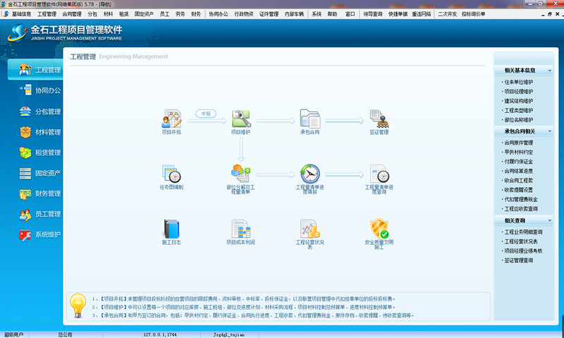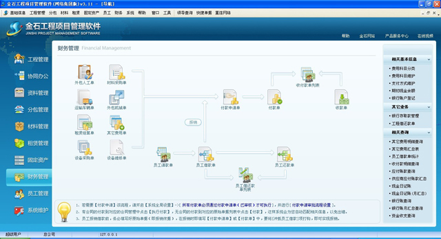 本軟件是金石軟件公司以眾多施工企業管理現狀為出發點,深入了解施工現場,經過七年地不斷完善與努力,打造成為一款成熟、靈活、實用性極高的信息化內控管理平臺。軟件以成本控制為核心,以資金管理為主線,全面解決項目管理難題,提升項目管控能力。對工程的投標管理、中標后的進度管理、分包管理、采購招標、材料管理、租賃管理、固定資產管理、員工管理、勞務管理、資金管理、押金管理、發票管理、稅金核算、聯營管理、文檔資料管理、物資管理、安全質量管理、證件管理、車輛管理、工程結算、等進行全方位管理,并提供強大的OA功能,能夠實現各部門之間的數據共享及業務單據網上簽批審核。并且提供了強大的自定義工作流驅動和各種流程開關,企業可根據自己情況自行設定,從而規范企業管理、讓工作流程正歸化、簡單化。通過工作流,讓信息送審、審批更貼近日常公司管理模式,申請人可隨時看到當前業務的審批進度和各領導的審批意見。