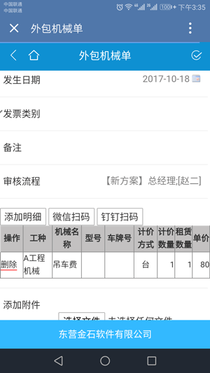 業務單據支持外掛附件的功能,通過PC終端連接高拍儀、攝像頭拍照或手機在錄單時拍照等方式生成的照片存到單據附件中。比如可將現場供應商到貨清單、產品質量合格證拍照,存到單據附件中。還可以將一些證件、合同原件資料掃描或拍照存到軟件中,方便以后在PC終端或移動終端查閱。
