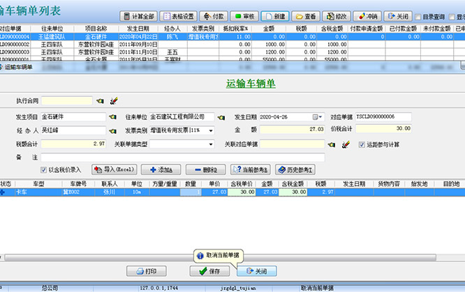 該單據(jù)是工程管理系統(tǒng)中車輛管理的基礎(chǔ)憑證,單據(jù)內(nèi)部的數(shù)據(jù),會對【工程成本】、【應付賬款查詢】、【供應商應付賬款匯總查詢】、【運輸車輛匯總表】這幾個模塊產(chǎn)生影響。