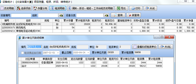 同時,已經生成的各種信息,可以在【外包機械明細查詢】模塊查詢所有的機械往來明細。