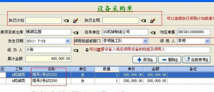 在使用機械設備的過程由于老化、意外事故等情況,需要重新采購設備。那么可以執(zhí)行設備采購合同,設備的基礎信息可以直接從合同中導入。