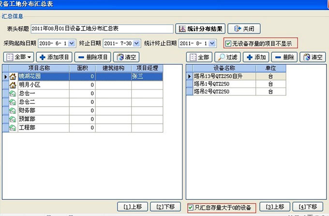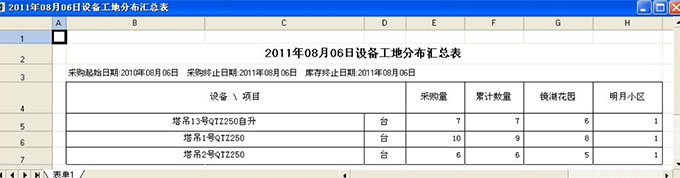 點擊上圖統計分布結果,即可出現詳細信息,設備各個工地的分布情況(包括新采購和設備累計數量)。