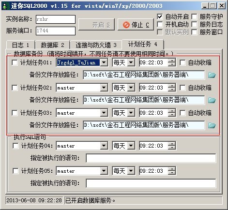 打開服務器端,到第四選項卡計劃任務中,選擇好需要備份的數據庫名稱、
