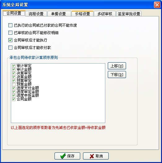 四、進行【全局設置】,用戶要根據自己公司的實際情況進行設置,多余的控制流程要去除,需要的要打鉤。如下圖: