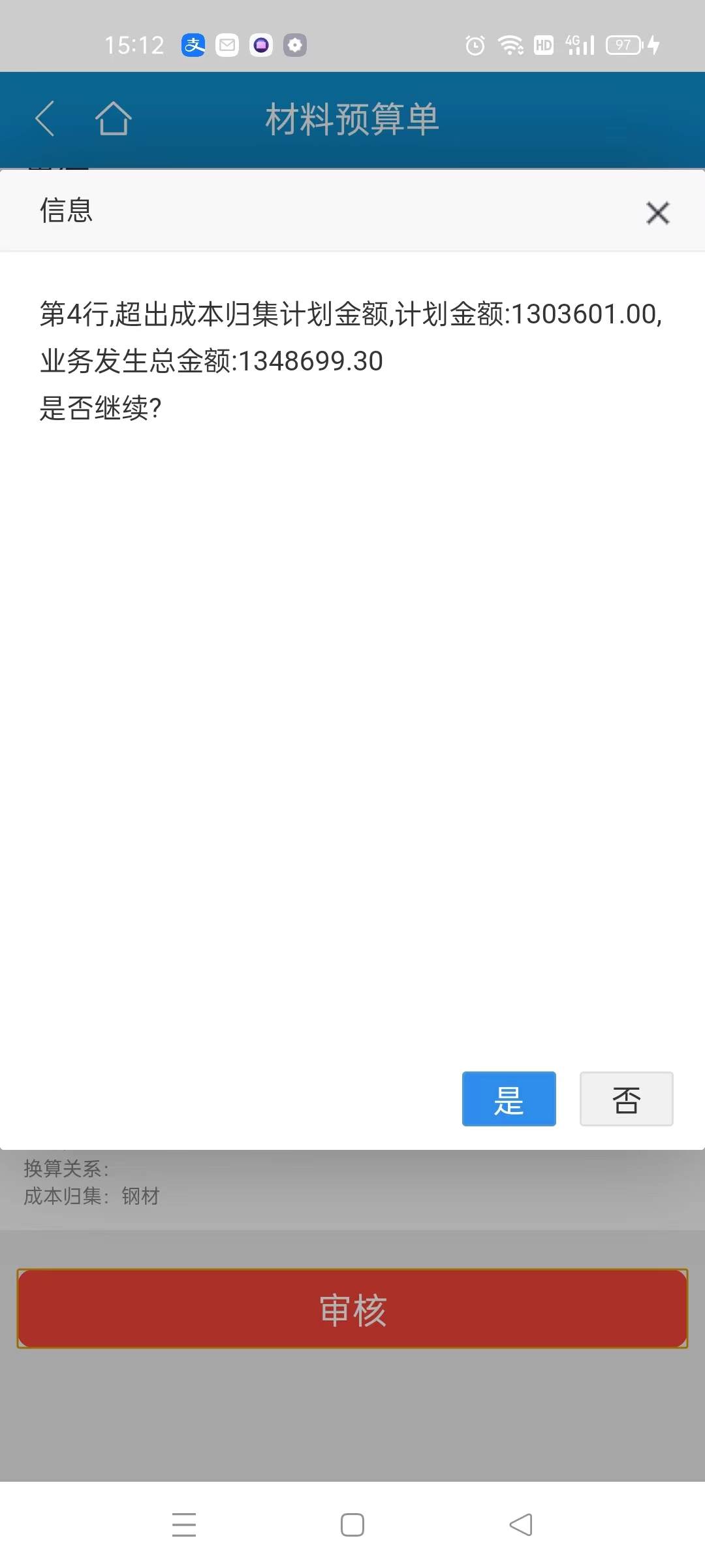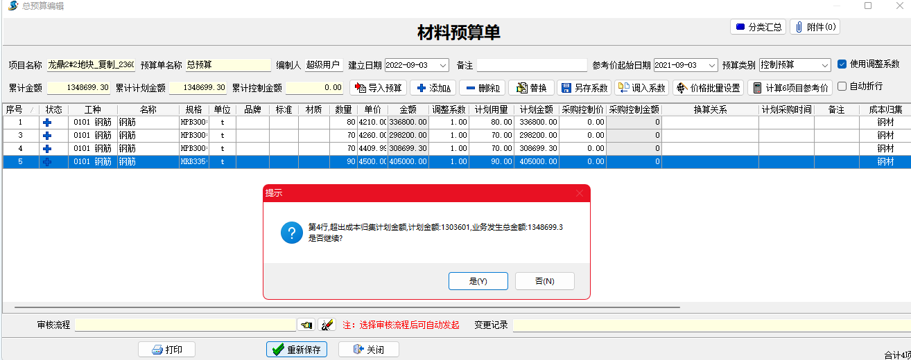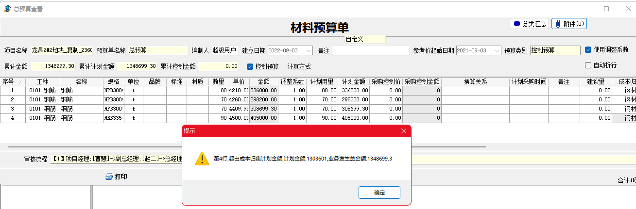 材料預(yù)算單超出成本計劃設(shè)定金額時系統(tǒng)會自動提示。