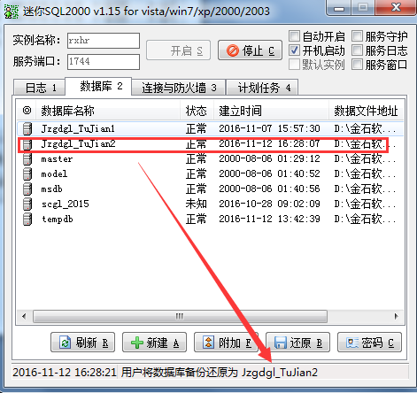 2.打開金石客戶端→連接設置,更改下數據庫名稱為我們還原的數據庫名稱Jzgdgl_TuJian2
