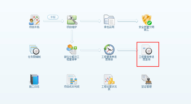 工程項目管理系統中進行項目進度查詢時,系統會根據項目部分以及工程量清單匯總項目進度。如圖: