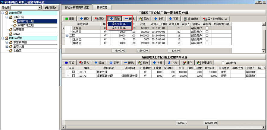 在《金石工程項目管理系統》中,進行項目部位分解時,可按照層次或級別進行分解,即添加“平級”或“子級”。