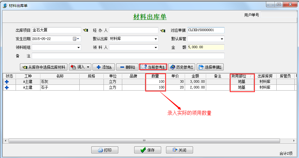 代入材料后,錄入實際的領用數量、所用部位,如下圖: