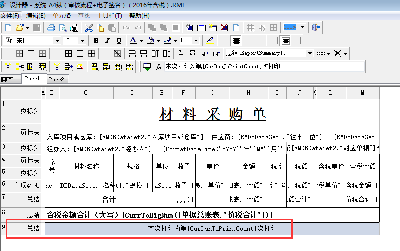 打印次數變量為:[CurDanJuPrintCount],在業務單據【打印】處,選中打印報表,點擊設計報表,在報表【總結】項中增加“本次打印為第[CurDanJuPrintCount]次打印。