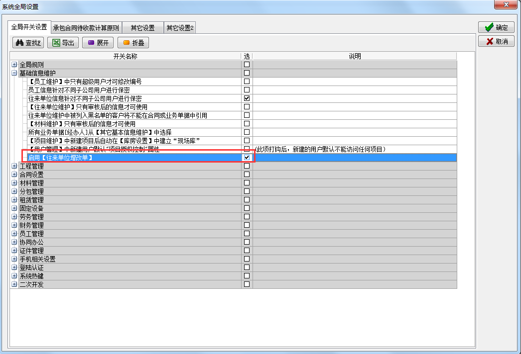 使用該功能之前需在【系統全局設置】中開啟‘啟用【往來單位增改單】’,開啟后可以使用往來單位增改單新增或者修改往來單位,同時往來單位維護禁止使用新增和修改功能。