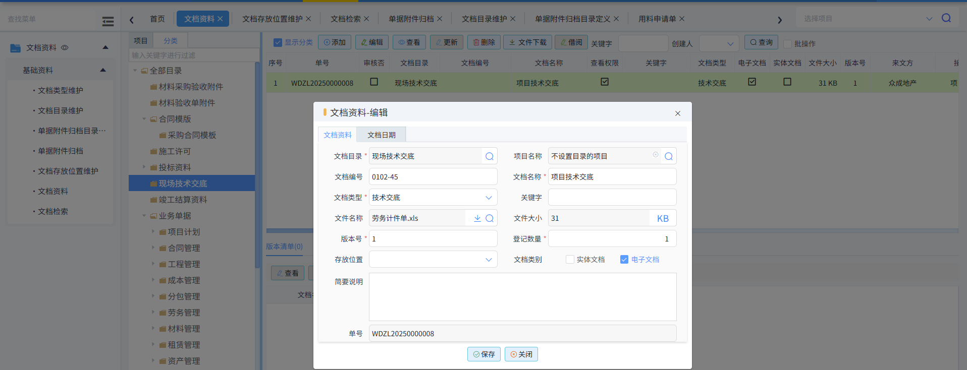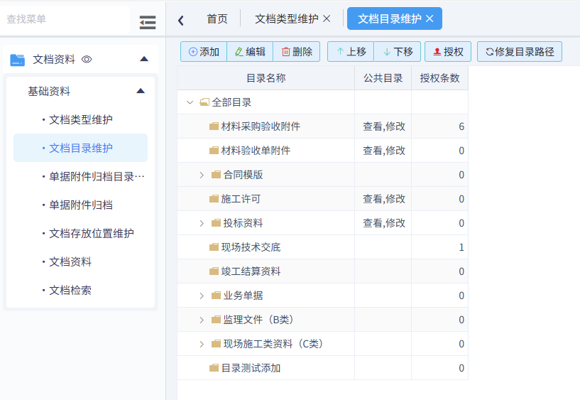 常見文檔資料的目錄需要提前維護(hù)好,以便后期資料上傳時選擇。如下圖
