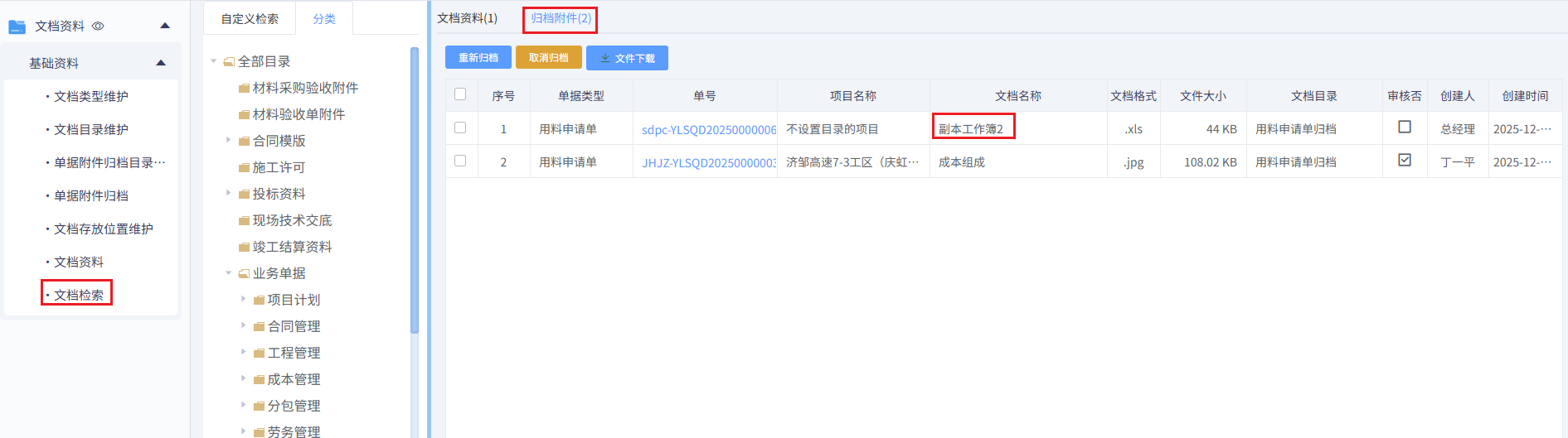 文檔檢索,用于查詢、查看和下載文檔資料上傳和單據(jù)附件歸檔后的資料文件,