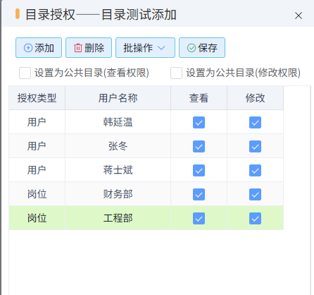 授權(quán):用于授權(quán)當(dāng)前目錄的權(quán)限,權(quán)限分為查看和修改,可以設(shè)置為公共目錄(查看權(quán)限),也可設(shè)置為公共目錄(修改權(quán)限)。如下圖所示,
