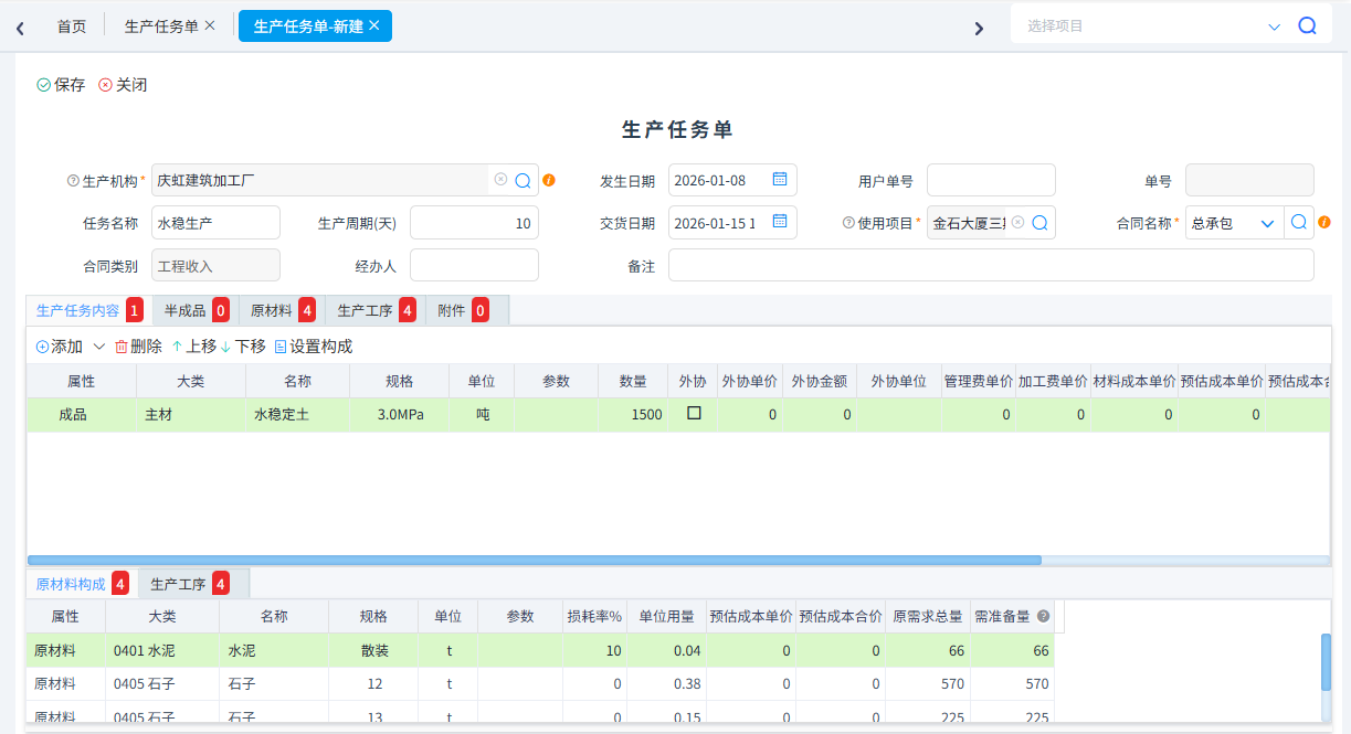 車(chē)間主任根據(jù)客戶需求和生產(chǎn)計(jì)劃下單生產(chǎn)任務(wù),生產(chǎn)任務(wù)單可以直接從物料BOM里選擇成品材料,自動(dòng)生成配比信息和工序,調(diào)取過(guò)來(lái)后還可以二次調(diào)整物料BOM和工序。