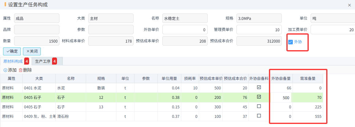 選擇需生產(chǎn)的材料后可以點(diǎn)擊設(shè)置構(gòu)成,再次調(diào)整物料BOM。在原材料構(gòu)成這里可以設(shè)置預(yù)估成本單價(jià)和查看原材料需求總量。
